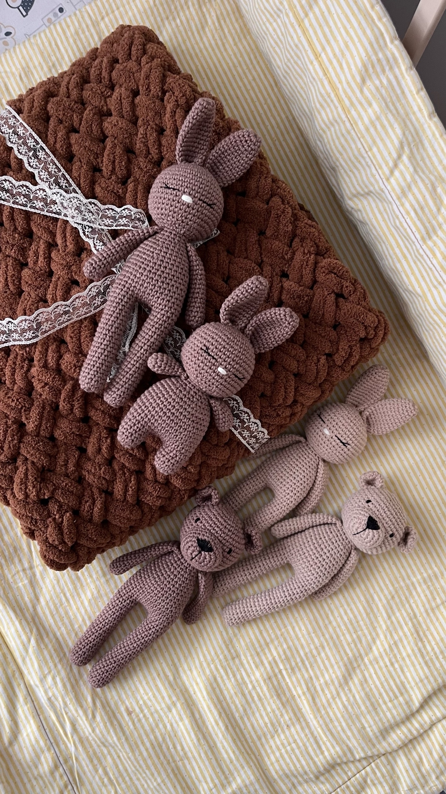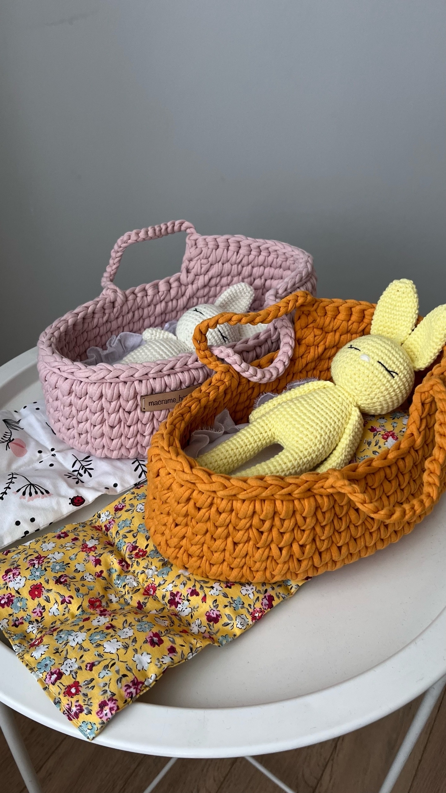 Нежная постелька в каждом комплекте. Люлька удобного размера для кукол и игрушек. Деревянное донышко позволяет изделию держать форму. Люлька связана из трикотажной пряжи высокого качества.
